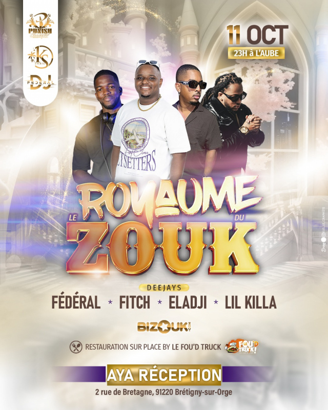 DJ FEDERAL & KS EVENT en collabaration avec PUNISH CONCEPT NO LIMIT prsentent ==>>> "LE ROYAUME DU ZOUK" <<== Samedi 11 Octobre 2025 ==>> <<== Animation assure par les meilleurs ==>> FDRAL / ELADJI / FITCH / LIL KILLA ---------- <<<=== TARIFS ===>>> Sur Place => Si disponible Restauration sur place assure par LE FOU'D TRUCK <<<=== LIEU ===>>> AYA RECEPTION 2 Rue de Bretagne, 91220 Brtigny-sur-Orge