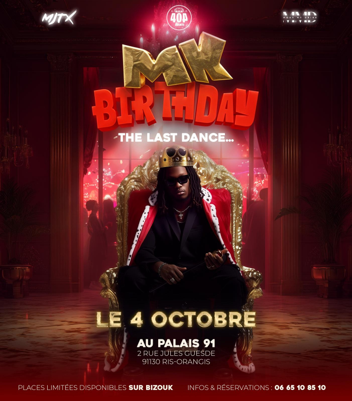 Mjtx prsente VENDREDI 4 OCTOBRE 2025 AU PALAIS 91 MK BIRTHDAY 1ere et 2me artistes dvoils KAMELON et COCOTTELAND en Show PLACES LIMITEES ICI SUR BIZOUK POSSIBILIT DE SE RESTAURER SUR PLACE... LIEU: PALAIS 91 2 Rue Jules Guesde 91130 Ris-Orangis Info & Rservation: 06-65-10-85-10